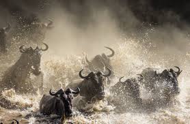 In areas where riverine forest meets open grassland, wildebeest crossings take on different characteristics. Animals emerge from woodland cover, assess the crossing point, and plunge forward in waves. Therefore, these locations offer unique photographic opportunities with varied backgrounds.